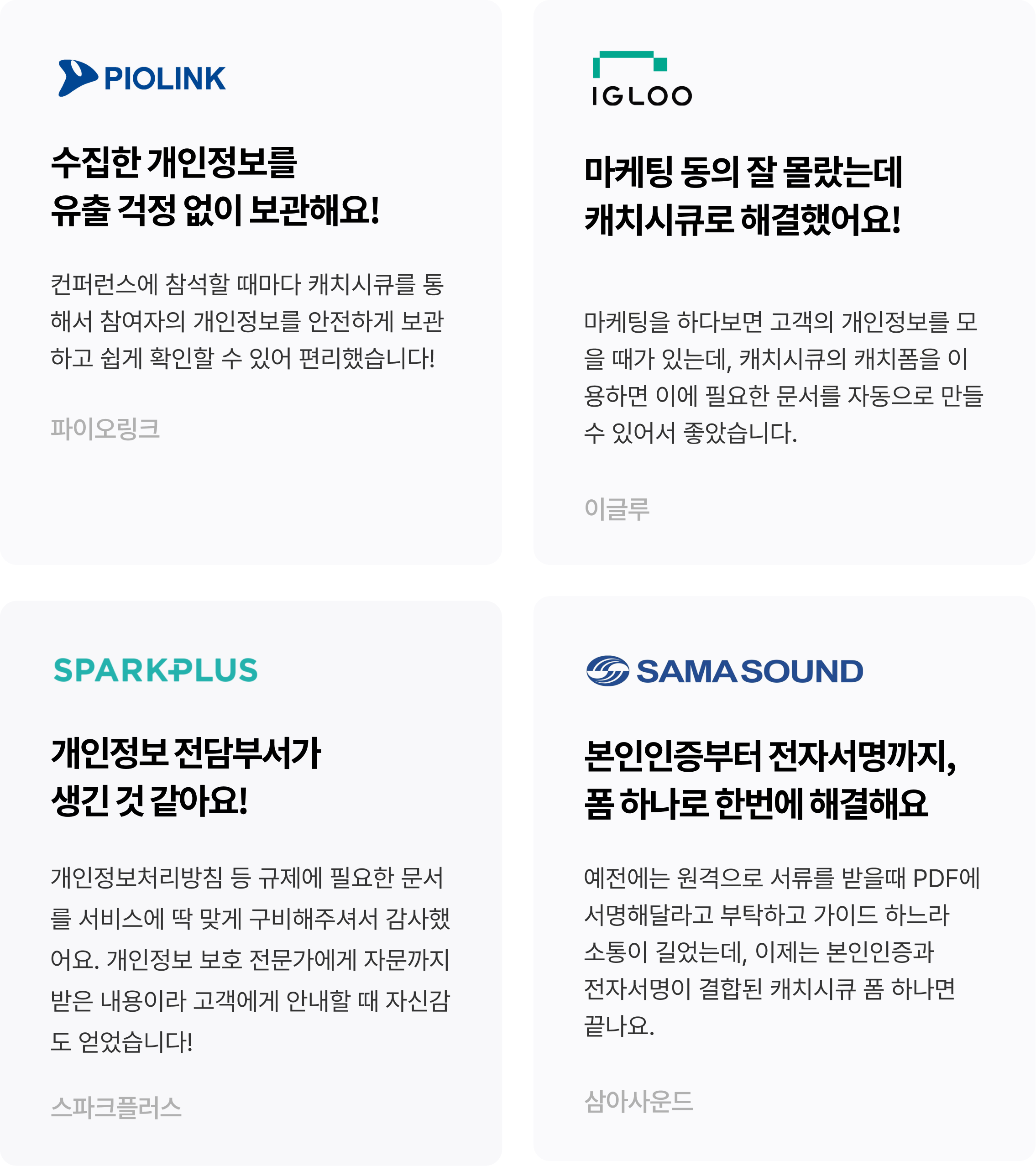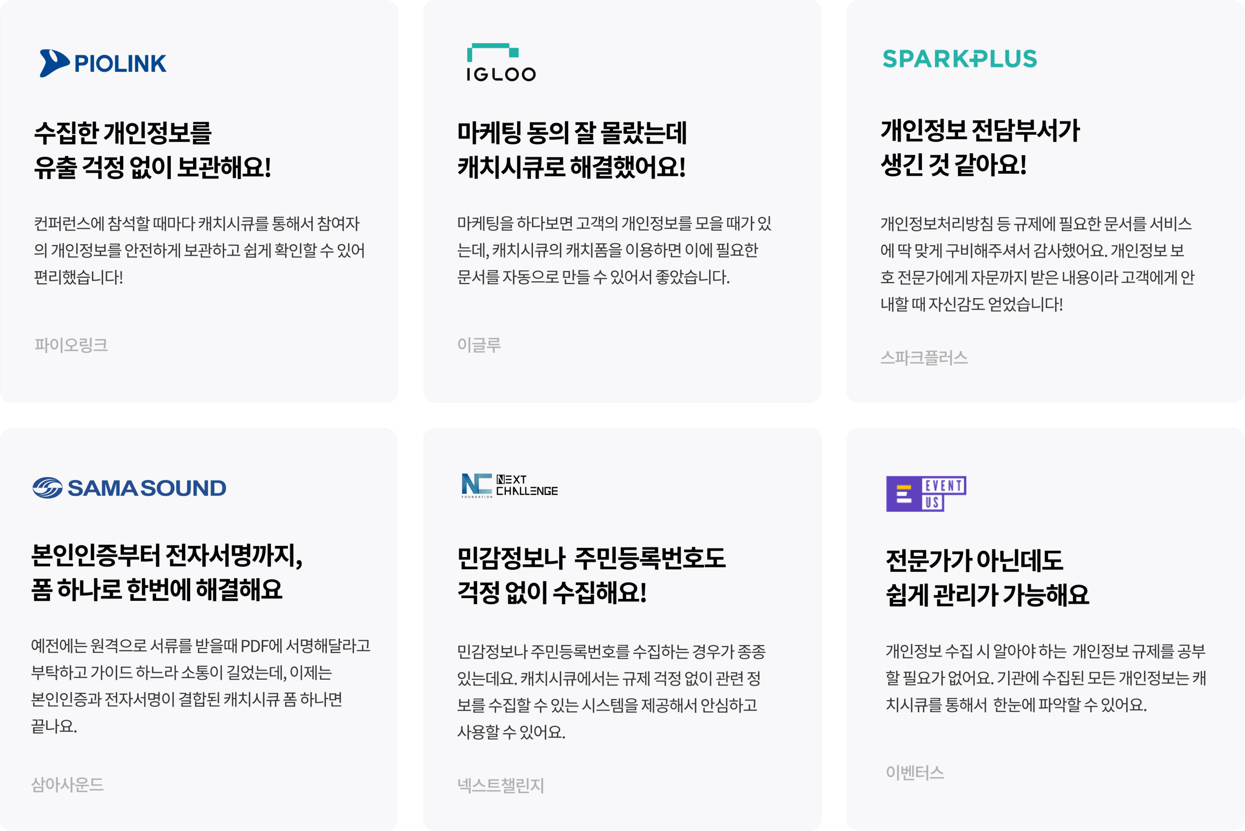 불시에 개인 정보 유출, 침해 등의 문제가 발생하는 경우 기업 내부에 법무팀이나 보안팀이 없다면 규제 대응이 어렵습니다. 캐치시큐를 이용하시면 저렴한 월 비용으로 개인 정보보호 규제에 즉각 대응할 수 있는 담당자의 역할을 대신할 수 있습니다.