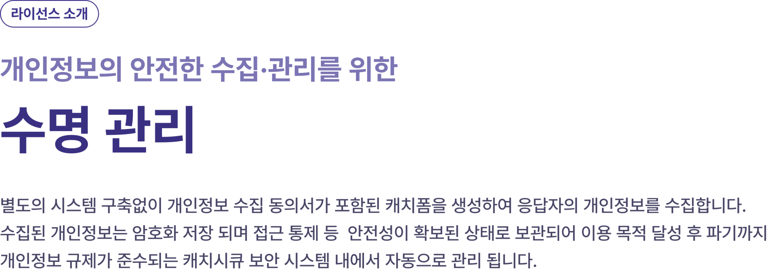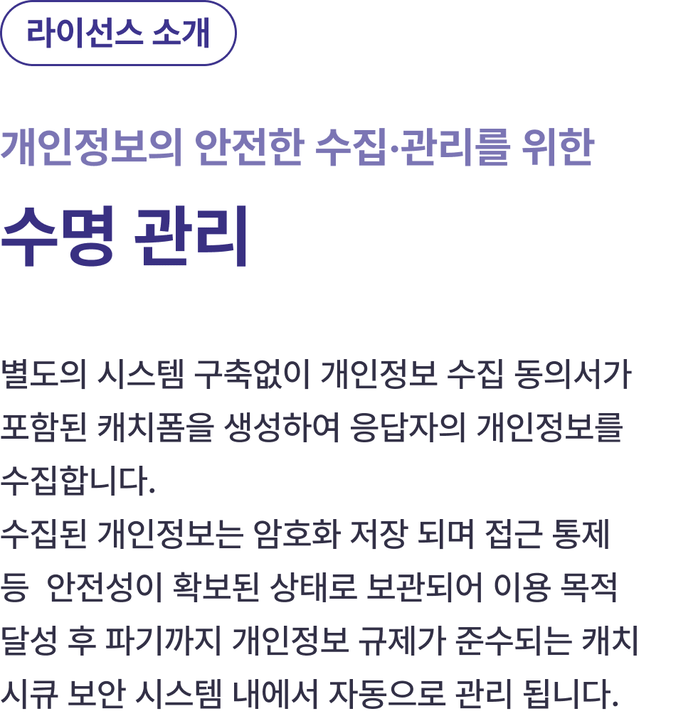 URL, QR 배포 등 일반적인 설문 폼과 동일한 기능으로 개인정보를 안전하게 수집할 수 있습니다.