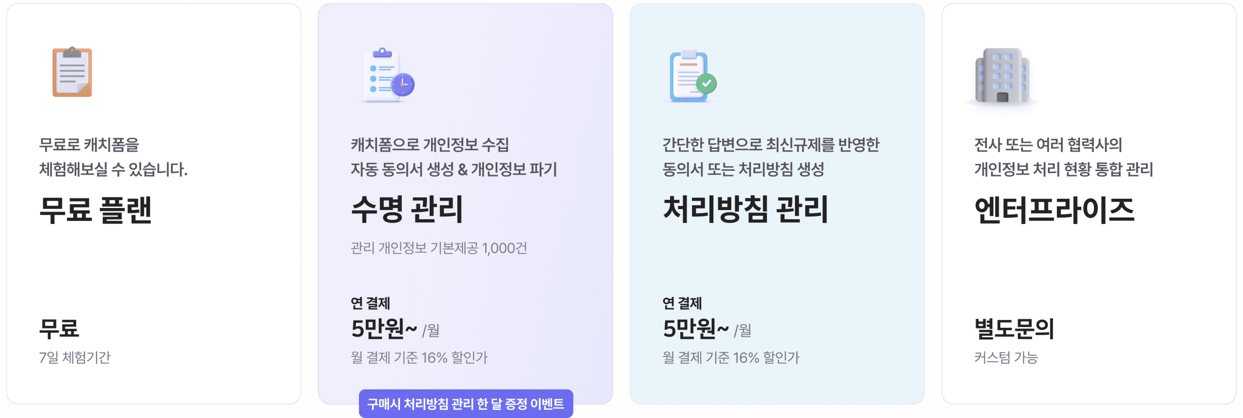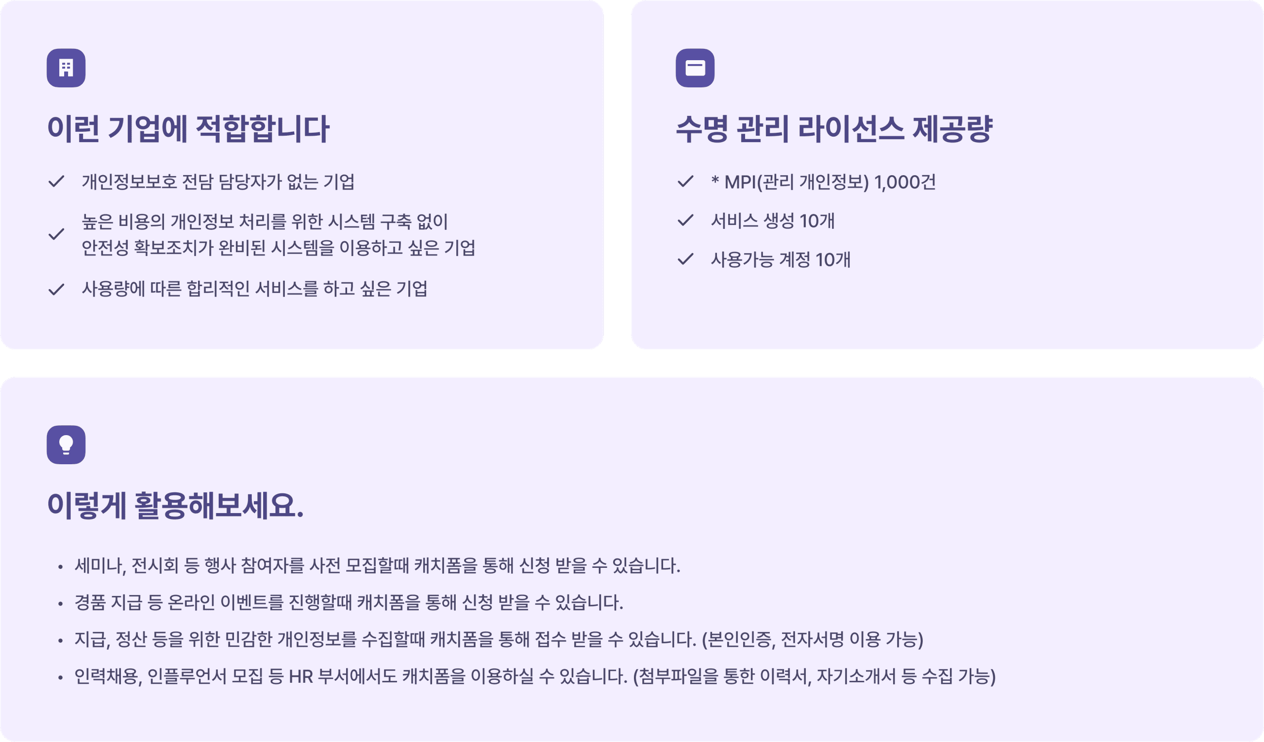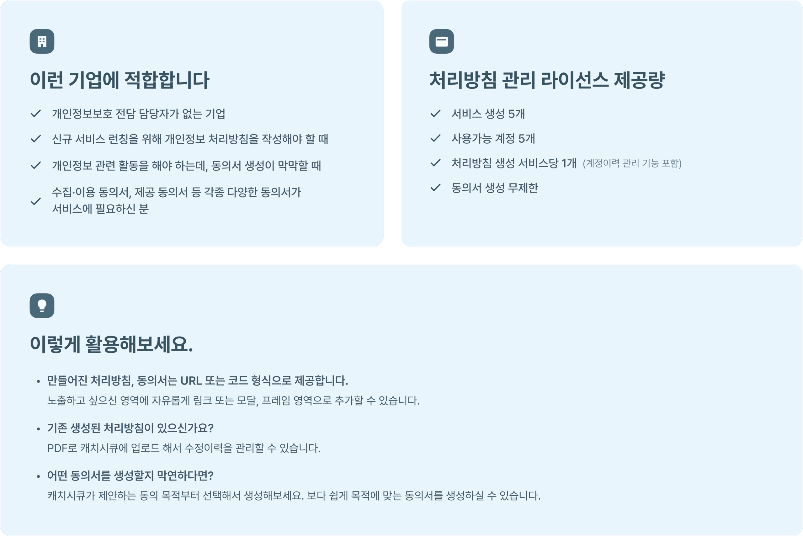 캐치시큐는 동의서와 처리방침을 문서 형태가 아닌 홈페이지에 바로 적용할 수 있는 URL 형태로 제공해 드립니다. 적용된 URL의 꾸준한 기능 업데이트 및 유지관리를 통해 저렴한 월 비용으로 개인정보를 더욱 더 안전하게 이용하실 수 있도록 도와드립니다.