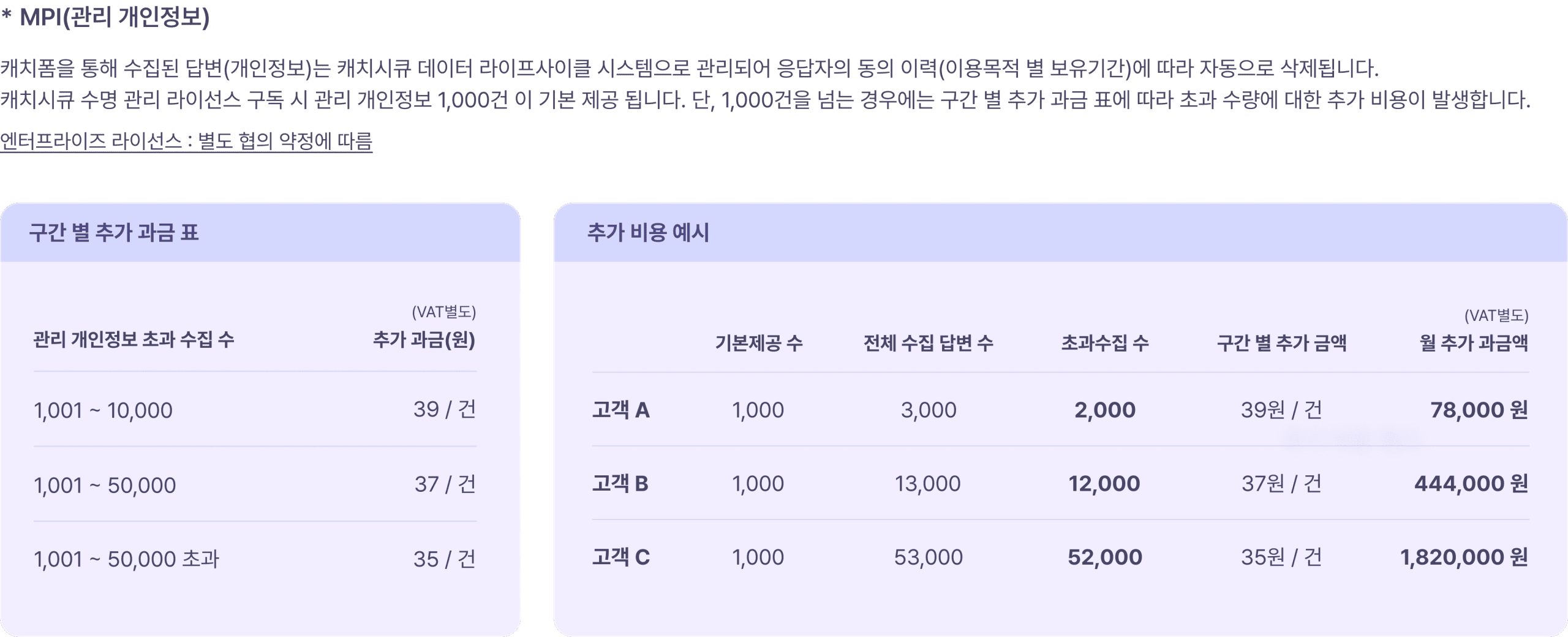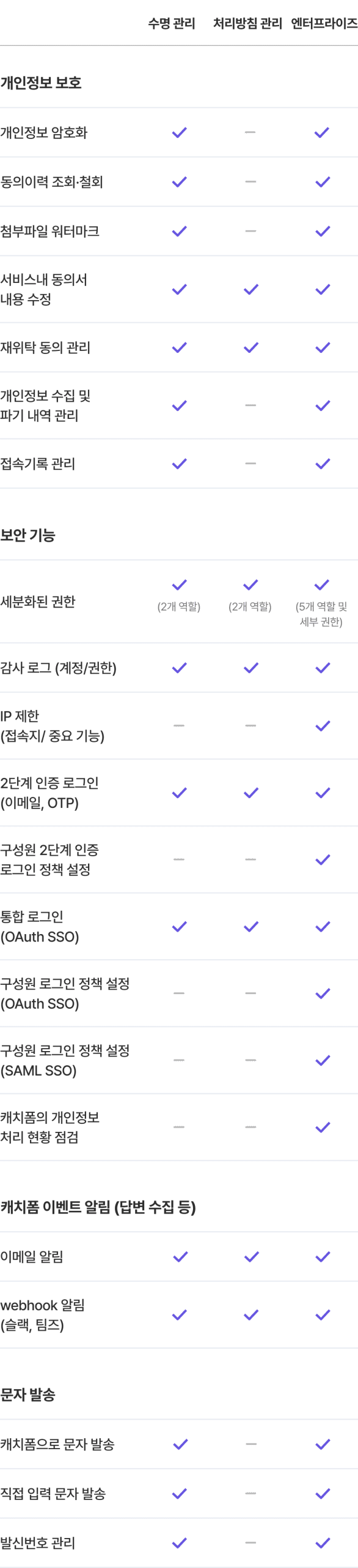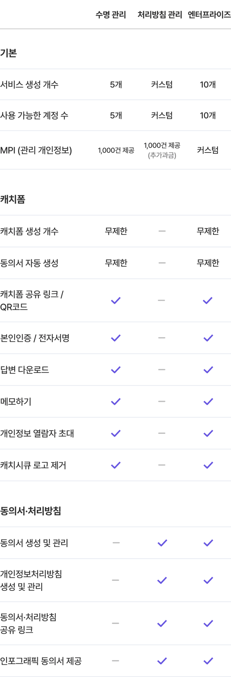 캐치시큐 요금제별 기능 비교
