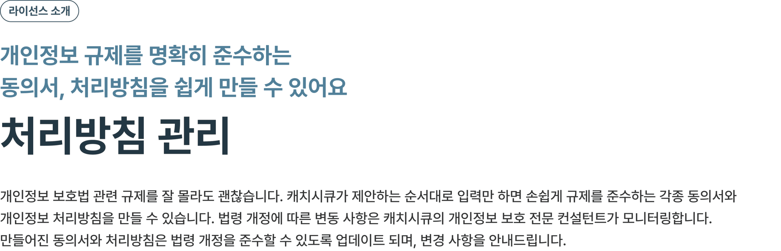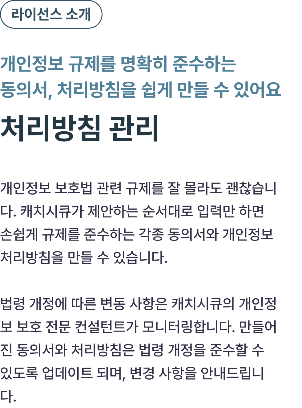 서비스 이용에 대한 계약 사항을 정리한 문서로, 캐치시큐는 개인정보와 관련된 동의서와 처리방침 영역을 서비스합니다.