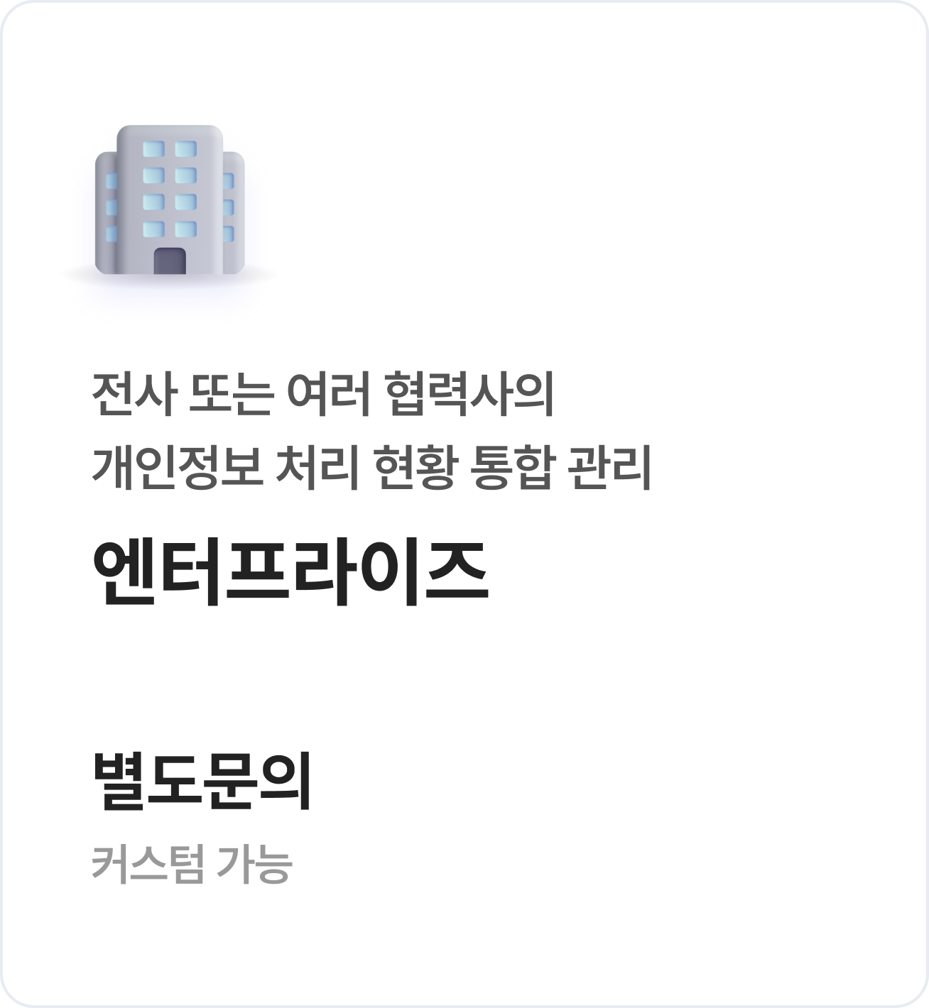 마스킹, 암호화, 첨부파일 워터마크, 작업자별 권한 설정, 접속 기록 저장 등 개인정보 처리에 필요한 기술적 보호 조치를 별도 구축하지 않고 이용할 수 있습니다.